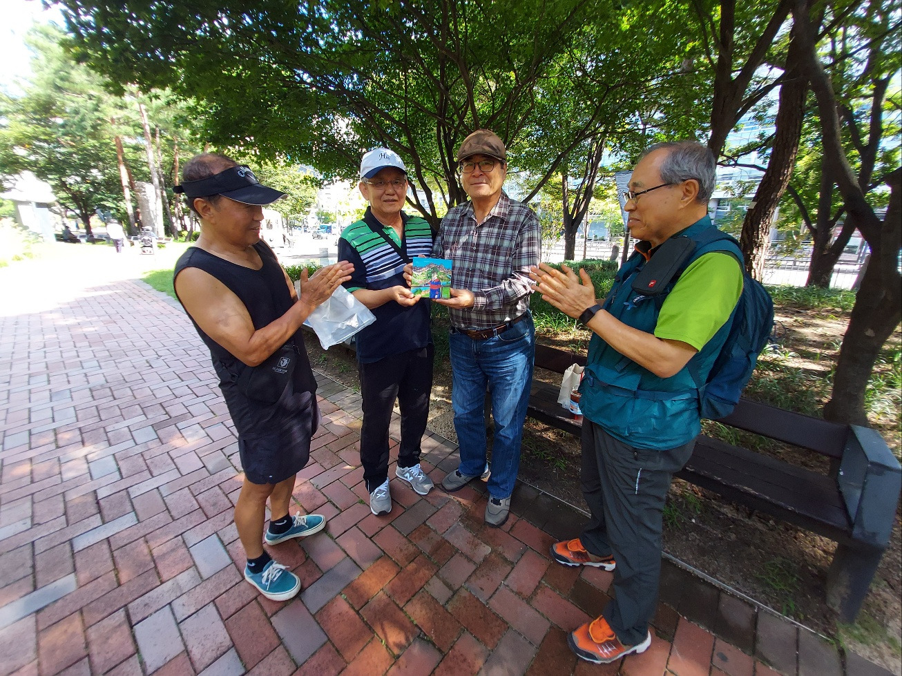 서울역사박물관근처 벤치에서 김정석화백이 그린 성용이 그림 증정식