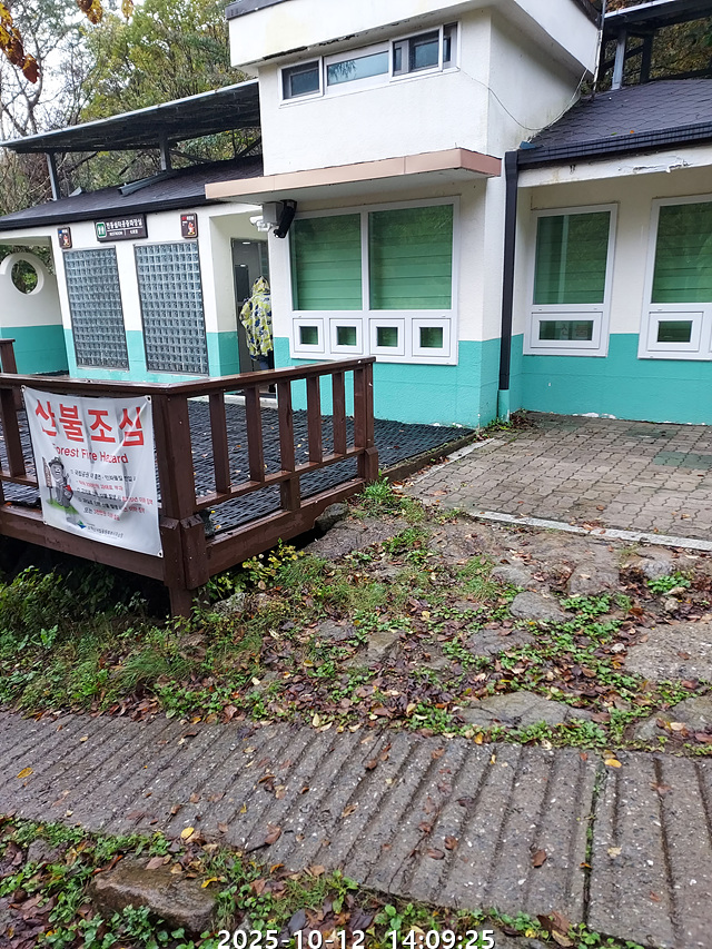정상에서 내려오자마자 우측의 주목감시소 건물에 들러 간단히 간식을 먹으며 비를 피했다.