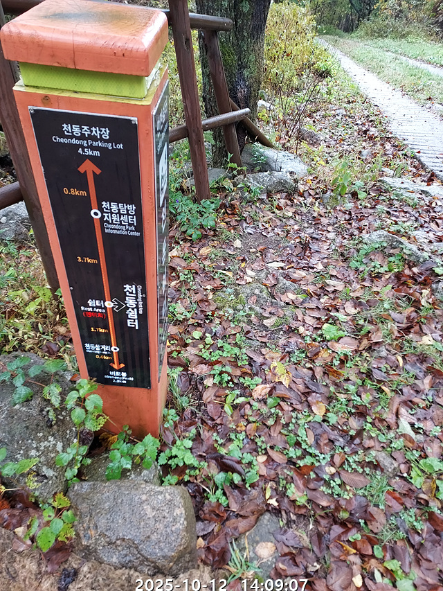 B코스는 천동주차장에서 천동쉼터까지 왕복인데 이 곳 삼거리에서 1.7km 내려가면 천동쉼터가 있다